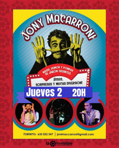Hoy las puertas del patio se abren para recibir a Jony Makarroni ¡Magia,malabares y pompas de jabón gigantes! Son los ingredientes de este plato que podrás degustar a la gorra.