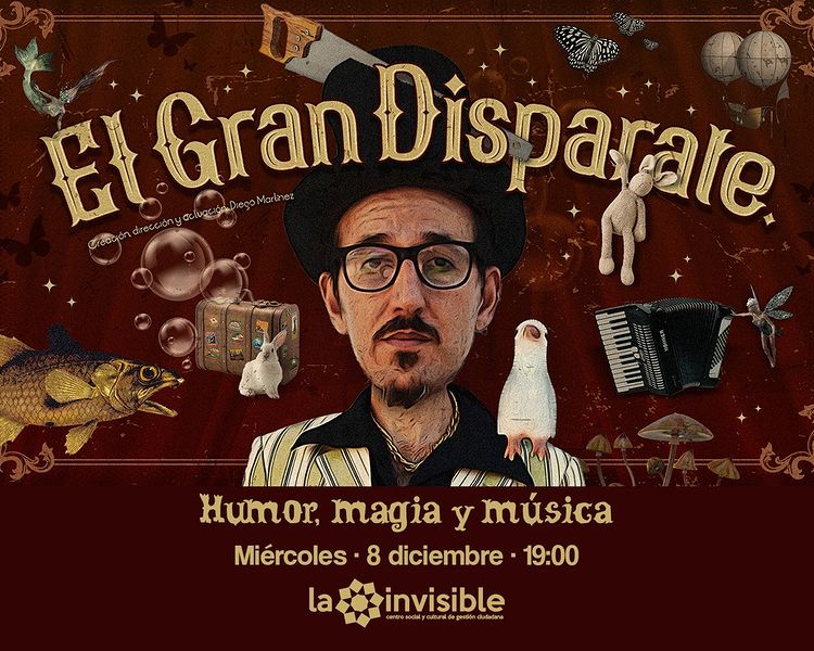 El Gran Disparate es un desternillante cóctel de: técnicas de clown, magia, música, situaciones non sense y humanidad, e intenta mostrarnos, a los tropezones, que la magia existe y está sucediendo aquí y ahora.