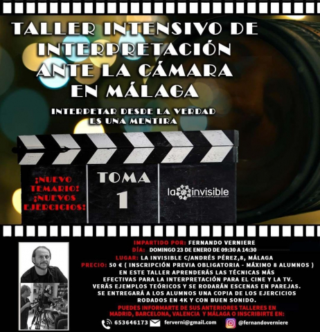 En el Taller intensivo de interpretación ante la cámara de La Invisible impartido por Fernando Verniere aprenderás que no sólo basta con memorizar las líneas del guion y crearse un personaje para lograr una buena interpretación en un medio audiovisual. Se enseñarán los conceptos más importantes y básicos de interpretación delante de cámara: Raccord, continuidad emocional entre planos, marcas y solapamientos. Y sobre todo, se hará énfasis en los planos de escucha y proceso mental en silencio. Se pondrán ejemplos de buenas interpretaciones ante la cámara y cada alumno rodará una escena en pareja. Las escenas serán rodadas en 4 K y con buen sonido.