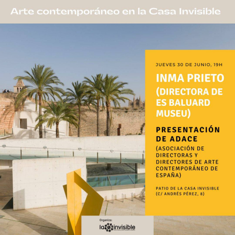 De este modo, Inma Prieto presentará la trayectoria, las líneas de trabajo y los debates que se articulan en la Asociación de Directoras y Directores de Arte Contemporáneo de España (ADACE ). Junto a ello, nos avanzará las claves del encuentro del CIMAM (Comité Internacional de Museos y Colecciones de Arte Moderno) que entre los días 11 y 13 de noviembre acogerá Es Baluard Museo bajo el título “/The Attentive Museum. //Permeable Practices for a Common Ground/” (“El Museo Atento. Prácticas Permeables para un Terreno Común”). Como anunciamos la pasada semana, la Casa Invisible también ha sido invitada a este encuentro que marca el sexagésimo aniversario del CIMAM , la única asociación a escala mundial de expertos en museos de arte moderno y contemporáneo, integrada a su vez en el ICOM (Consejo Internacional de Museos).