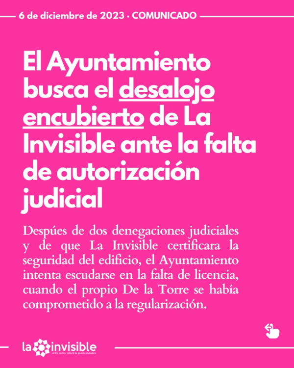 De hecho, solo en 2023 el juzgado ha denegado en dos ocasiones al Ayuntamiento la autorización judicial solicitada para desalojar el inmueble. No en vano, el juzgado subrayó la necesidad de garantizar el derecho a la tutela judicial efectiva que asiste a La Invisible, de forma que pueda contar con todas las garantías jurídicas.