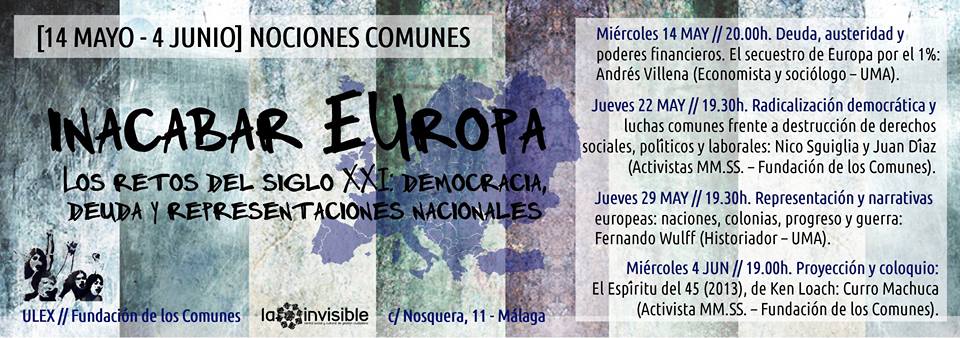 A las puertas de que en España comience un nuevo ciclo electoral, que se inicia con las elecciones europeas del próximo 25 de mayo y continua con las elecciones municipales y generales de 2015, desde el Área de Formación e Investigación de la Casa Invisible/ULEX pensamos que resulta oportuno, ante la coyuntura política que se avecina, organizar en Málaga un nuevo seminario de Nociones Comunes para que la ciudadanía pueda tener acceso, debatir y reflexionar sobre los temas antedichos. La regeneración política está tan acaba como la política representativa tradicional. La abstención, según los datos que las encuestas arrojan, no para de crecer, por lo que cada vez es más evidente que no hay lugar para la vieja política profesional. Los movimientos sociales tienen que armarse de agencia y romper la lógica de los partidos, buscando no sólo entrar a formar parte de las instituciones para democratizarlas y abrirlas desde abajo a la clase trabajadora y a toda la ciudadanía, sino también construyendo nuevos espacios de poder y decisión al margen de las dinámicas estatistas. Es necesario, en definitiva, que se cree una potencia constituyente que vaya más allá del sistema pluripartidista – bipartidista en la práctica–, de las elecciones y de la actual representatividad parlamentaria; una potencia constituyente que sea capaz de poner en jaque a las instituciones que controlan y precarizan nuestras vidas, que combata los recortes, que desafíe los límites democráticos que impone la Constitución de 1978 y los tratados europeos; en fin, una potencia constituyente que origine alternativas al agotado proyecto de la UE, subordinada a la Troika y los mercados.