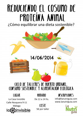 Este sabado 14 de Junio finaliza el “Ciclo de talleres de huerto urbano, consumo sostenible y alimentación ecológica” en La Invisible. Este sábado tendremos un taller de alimentación consciente orientado a la reducción del consumo de de proteína animal. Daremos pautas para equilibrar nuestra dieta, como combinar los alimentos, fuentes alternativas de proteína, etc..