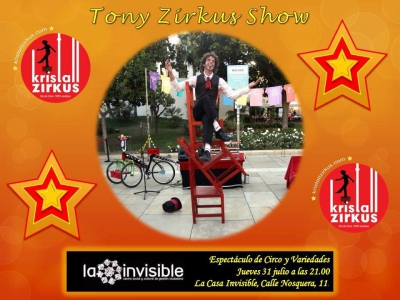 Este jueves Tony Zirkus, nos regalara un show donde combinara de tres a cinco pelotas (... y con solo dos manos!). Números de equilibrios imposibles sobre inquietos rulos, sillas acrobáticas o monociclo. Y todo ello, en todo momento, sin despeinarse un solo rizo, ¡oiga!