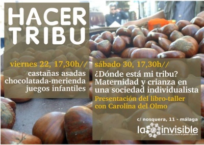 Dice el proverbio africano que para criar a un hijo hace falta toda la tribu, pero en Occidente nos hemos quedado sin ella. Hacer tribu Viernes 22, 17,30h, Castañada-chocolatada-juegos infantiles Sábado 30, 17,30h. Taller - Presentación del libro: ¿Dónde está mi tribu? Maternidad y crianza en una sociedad individualista.Con la presencia de su autora Carolina del Olmo.
