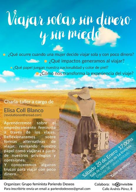 Viajar solas sin dinero y sin miedo es un taller de empoderamiento feminista a través de los viajes, de reflexión sobre formas alternativas de viajar, de revisión de nuestro papel como viajera/os/es a partir de nuestros privilegios y opresiones. Y de viajar con poco dinero, claro.