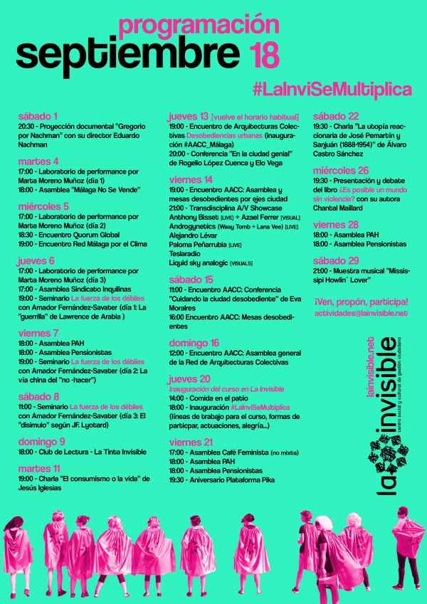 Iniciamos este curso con una programación repleta de actividades culturales y sociales para reflexionar y hacer juntas. Vamos a multiplicar la diversidad, la complejidad y la vida de La Invisible contigo, estamos convencidas de que la alegría de hacer juntas es la mayor fuerza que tenemos.