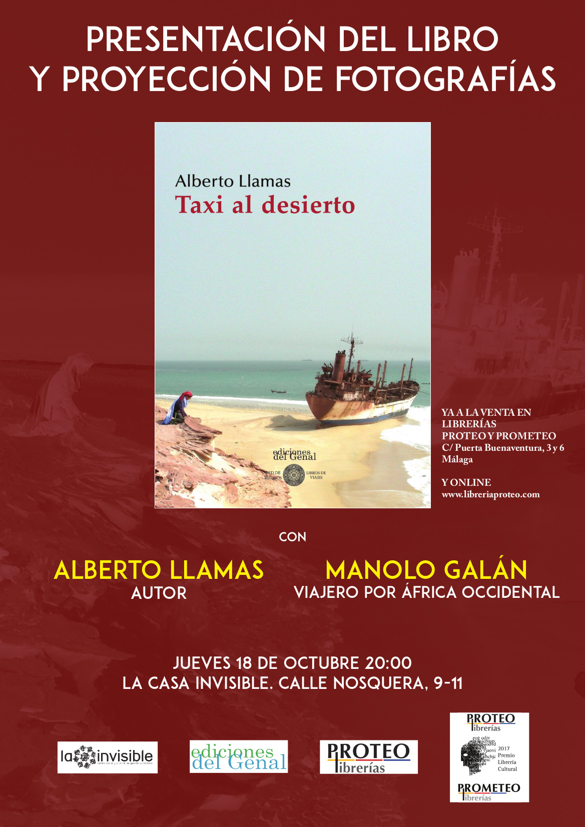 Para la presentación contaremos con Alberto Llamas, autor de la novela, y Manolo Galán, viajero por África Occidental, que proyectará fotografías de la zona y sus habitantes, que ambos irán comentando abiertos a dudas, preguntas y comentarios, tanto sobre las fottografías como sobre el la novela.