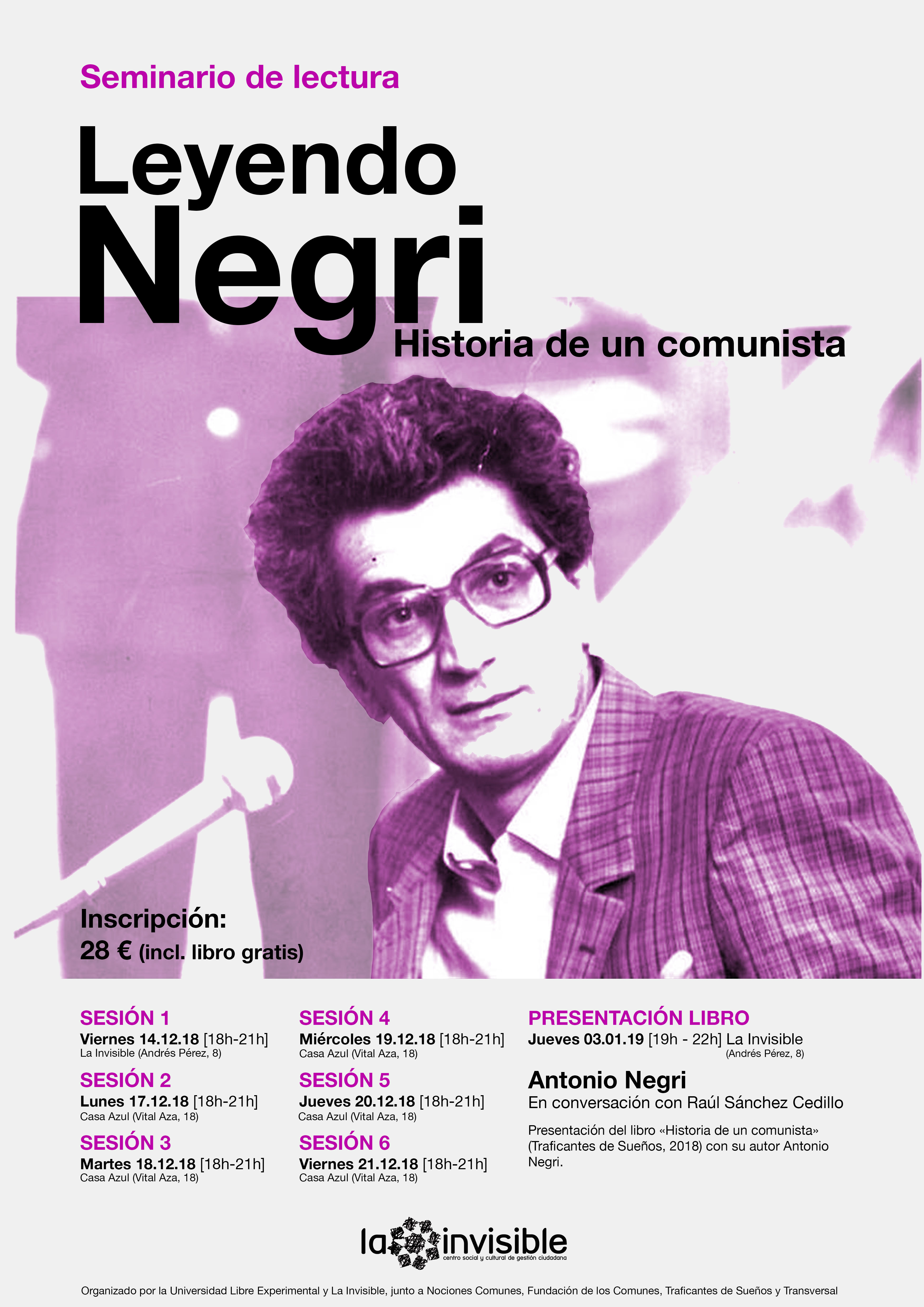 El 3 de enero de 2019 estará Toni Negri en La Invisible presentando su autobiografía "Historia de un comunista" y además durante la segunda mitad de diciembre (14-21 dic) haremos un seminario de lectura a través de este libro y en conexión con algunas de sus aportaciones teóricas más importantes. Uno de los pensadores más importantes de nuestro tiempo, para el que teoría y vida no se distinguen.