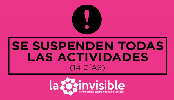 Debido a la situación de crisis sanitaria y de cuidados que ha aflorado con el COVID-19, hemos decidido suspender todas las actividades públicas de La Invisible durante los próximos 14 días, así como cerrar el patio desde hoy hasta el próximo martes 17 (donde se reevaluará la situación).