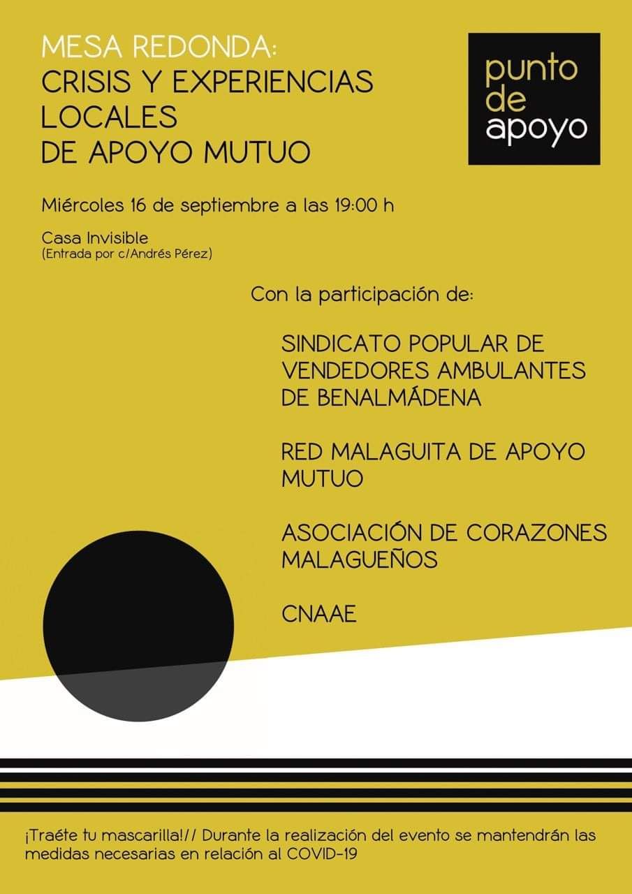 Nos ayudarán a arrancar el debate las compañeras de la Red Malaguita de Apoyo Mutuo, Corazones Malagueños, Sindicato Popular de Vendedores Ambulantes de Benalmádena y CNAAE.