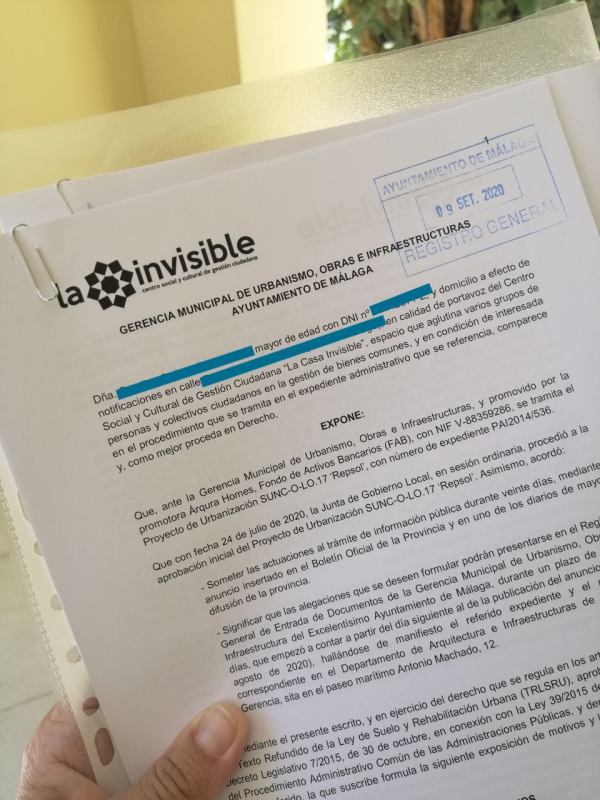 La Casa Invisible presenta un documento de 20 páginas de alegaciones a favor del Bosque Urbano Málaga. Como comunidad, aportamos nuestro granito de arena a una iniciativa ciudadana sin parangón y así paralizar el proyecto especulativo que pretende llenar de hormigón y construir torres y un centro comercial en los terrenos de Repsol.